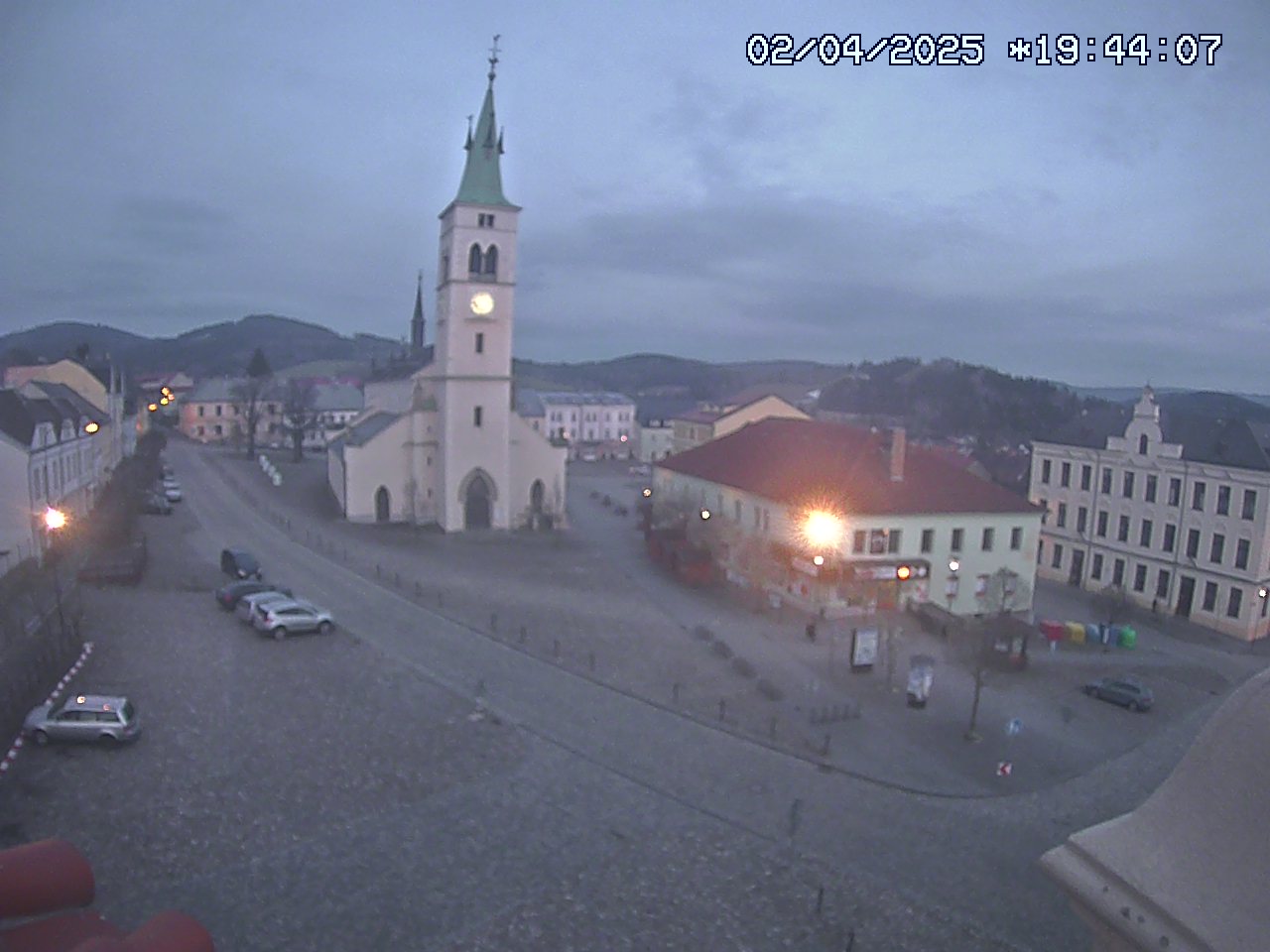 Nebespán je přímo na náměstí v Kašperských Horách, vedle Policie ČR (známá budova Policie Modrava).