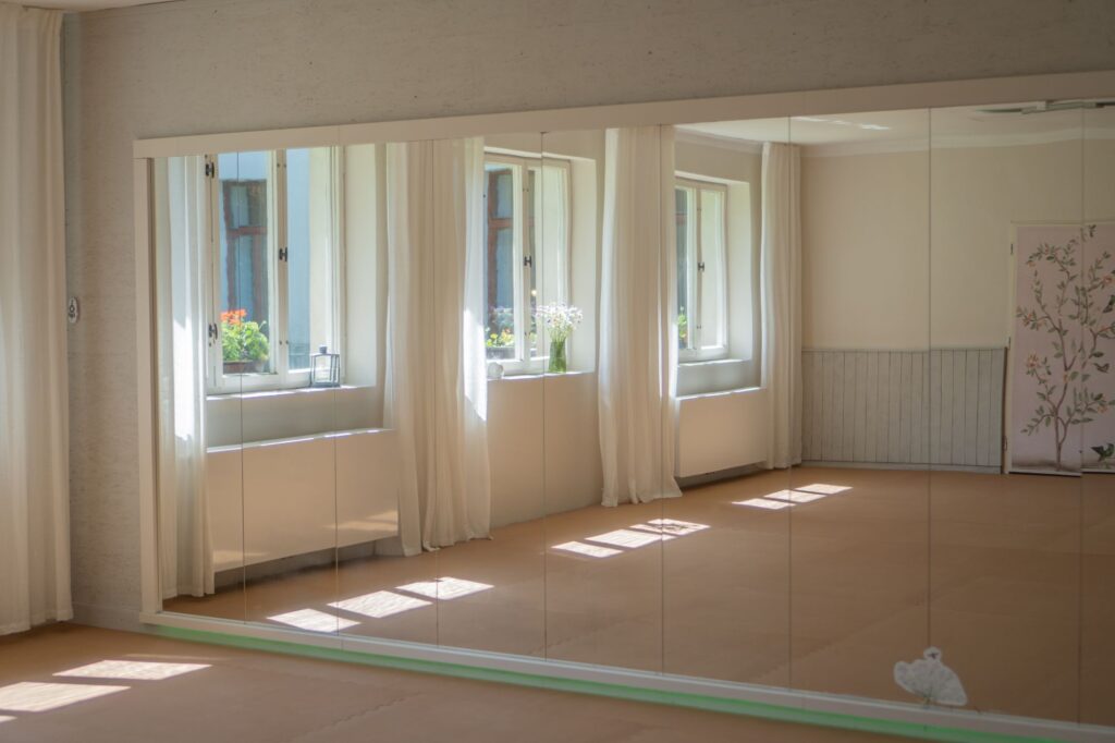 Naše tělocvična se zrcadly je v zadní části Nebespánu, 3 velká okna vedou přímo do velké udržované zahrady. Je ideální pro cvičení skupin do 14 osob. Můžete ji ale volně využívat i pro vlastní cvičení nebo ranní protažení. Cvičební podložky, overbally a cvičební gumy jsou k dispozici. Díky ztlumitelnému osvětlení si můžete vytvořit velmi příjemnou atmosféru.